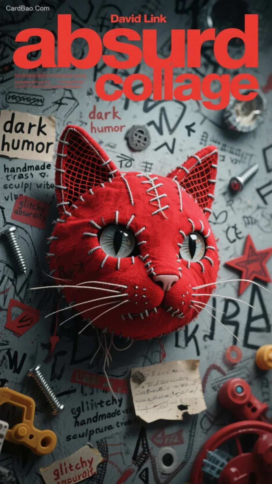 Absurd collage poster in the style of David Lynch, featuring a red stitched cat head made of embroidery fabric and plastic mesh, surreal mixed media elements like screws, toy parts, handwritten notes, stars and arrows, background full of chaotic handwritten English letters and symbols, dadaism aesthetics, dark humor, handmade trash sculpture vibe, glitchy absurdity,