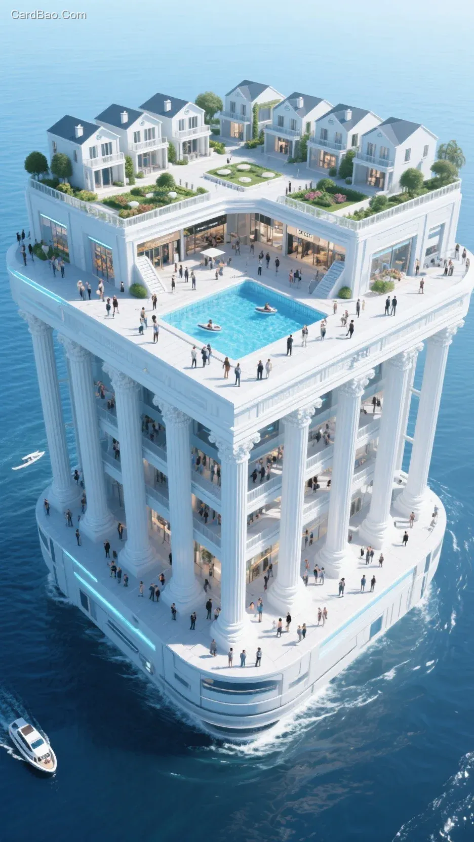 一条巨型船叫诺亚方舟,整体由钛白金属制作,上面是一座未来城市,顶层有整齐划一的别墅布局,有九层高楼,多根罗马柱支撑,顶层有花园有广场商场等,中间有一个泳池,行驶在大海上,人来人往,众多游客参观拍照。
