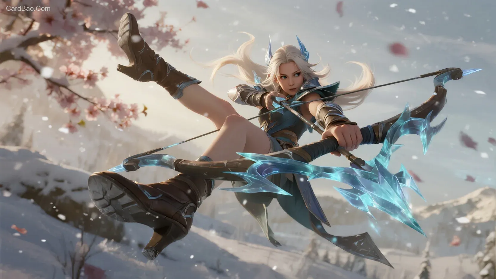 Realistic camera portrait photography, medium close-up shot. A snowy cherry blossom field as the authentic backdrop, featuring a real-life League of Legends cosplayer. Deep V-neck, revealing long legs and fair skin, complemented by falling snowflakes and ice crystal particle effects to create a cold yet dreamy atmosphere. Ashe, clad in ice crystal armor, draws the bowstring, with her feet resting on a massive ice bow. Her hair flows gently in the wind as she leaps weightlessly into the air.