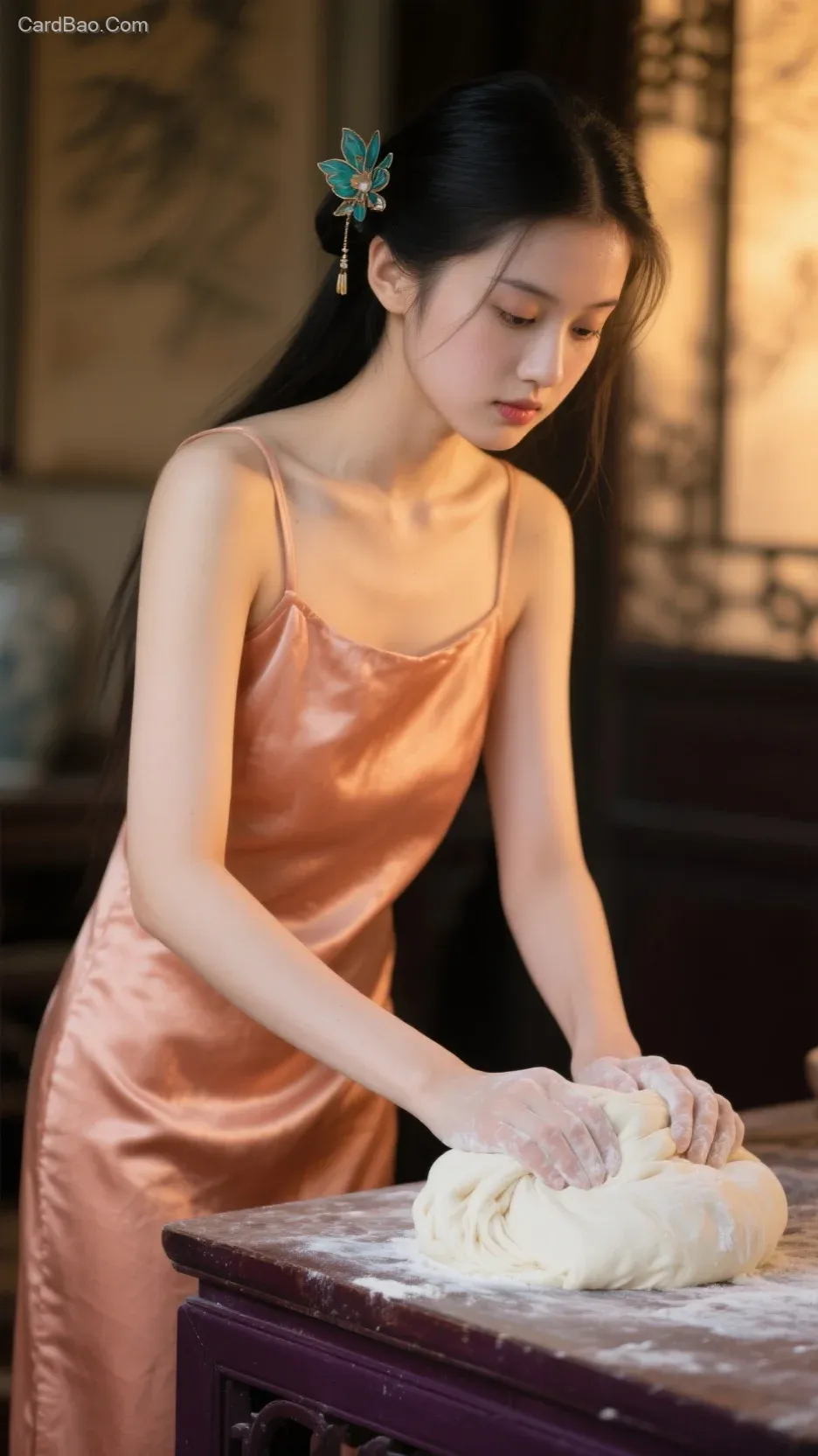She is intently kneading dough, her stunning beauty reminiscent of the Queen of the Daughter Kingdom descending to the mortal world: her face is a soft oval shape, her eyebrows like distant mountains tinged with azure, and her bright, limpid eyes are cast downward in concentration, long lashes fluttering like butterfly wings. Her nose is elegantly straight, and her cherry lips are slightly pursed, exuding a serene and focused expression.