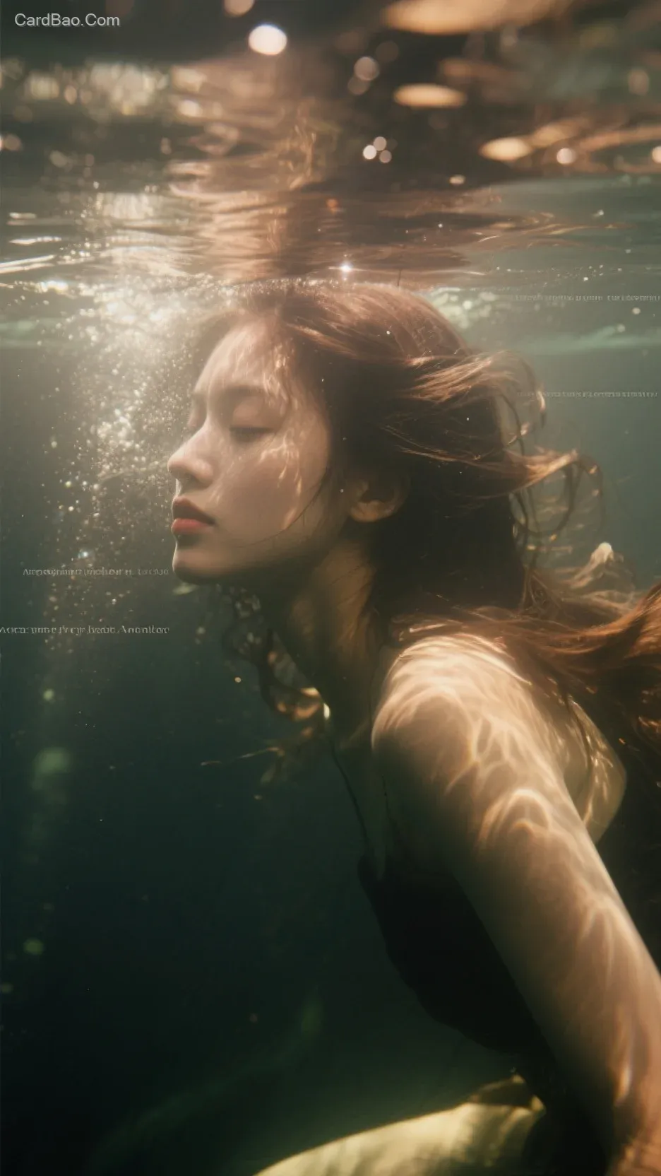 水下摄影,一位少女,梦幻光影,水透明肌理反光,迷乱,颓废,折射光影,光影弥散,棕黑色系