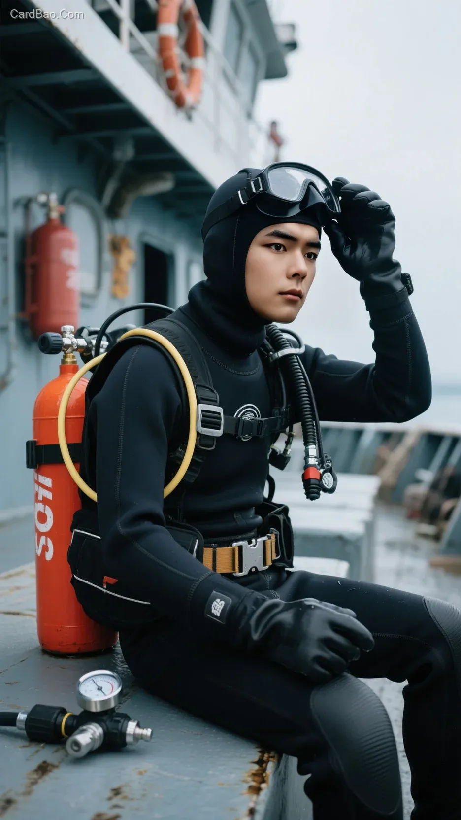 ##27岁水员刚出水摘下头套和水镜,坐在作业船的甲板上,身上还背着橙红色的压缩空气瓶,气瓶上印着醒目的白色标识,旁边的调节器、压力表等设备一应俱全且崭新发亮。腰间系着一条多功能潜水腰带,照明手电等工具,手上戴着黑色橡胶潜水手套。画面是潜水员完成任务休息的场面