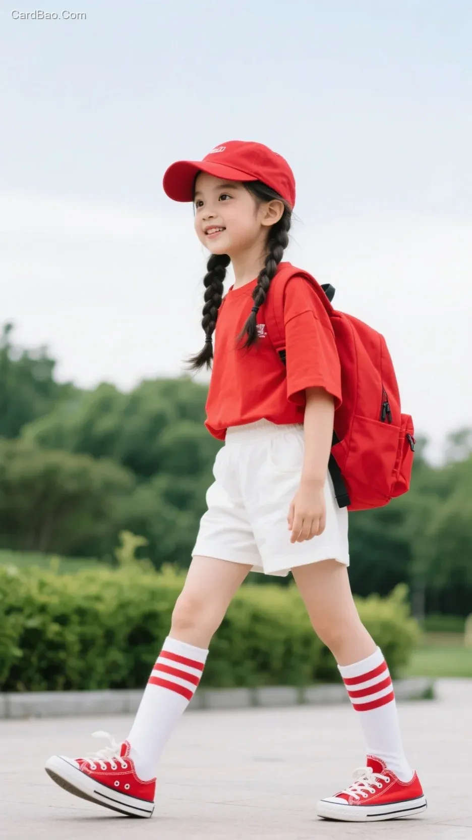 小女孩,双麻花辫,红色棒球帽,红色宽松T恤,白色的短裤红色双肩背包,白色带红条纹长袜,红色帆布鞋,户外,远处有绿植、现代日常风格,中景