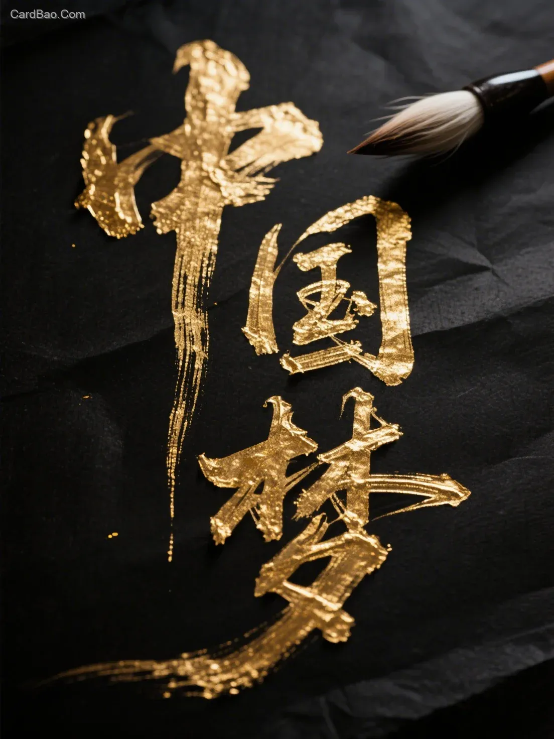"中国梦"二字采用连笔狂草,羊毫笔毛分叉形成的枯笔效果,金属质感金箔颜料,深黑宣纸背景,侧光照射下的墨迹立体感