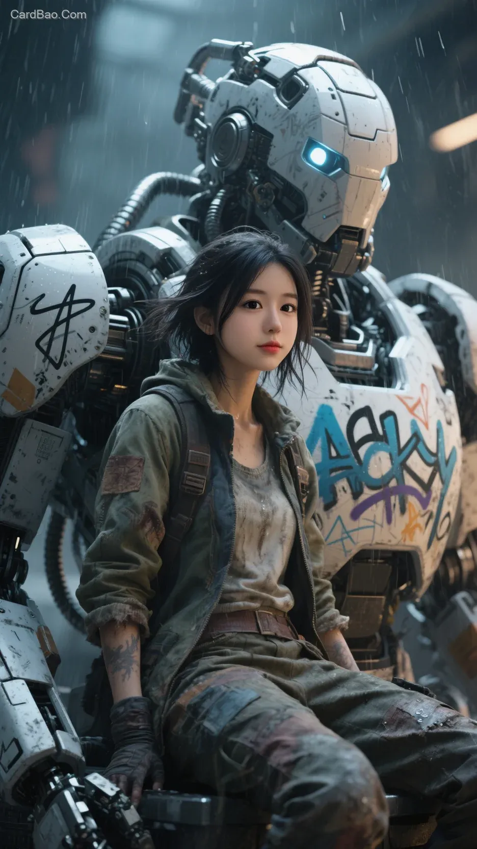 ##虚幻5引擎打造,Acky Bright风格,涂鸦线条飘逸装饰元素点缀。画面抽象与前卫潮流元素碰撞,天野喜孝的艺术特征,画面没有文字元素。一个穿著廢士服装的女机械师,坐在巨大机器人的肩头部位,坐在机器人头部旁边的肩膀位置,巨大化,巨物恐惧创作一幅达菲·谢里丹风格的油画,融合黑泽明电影美学与20世纪福克斯大片质感的杰作。最大化氛围与张力,以兼具游戏感与写实感的模型呈现。她的面容流露坚定、智慧与高度紧张感。包含以下细节:抖动景深、多层景深切换、水雾、一缕飞扬的发丝、凝固的瞬间、动态模糊、超微距、面部极致特写、深邃眼眸,采用冷色调。纵横比9:16。细节繁复精美,搭配戏剧化的光影效果,呈现出超写实主义风格,画面如照片般逼真,充满电影质感,达到8K分辨率,采用虚幻引擎制作——画面比例9:16,使用niji 5模式,风格富有表现力,清晰度参数180。
