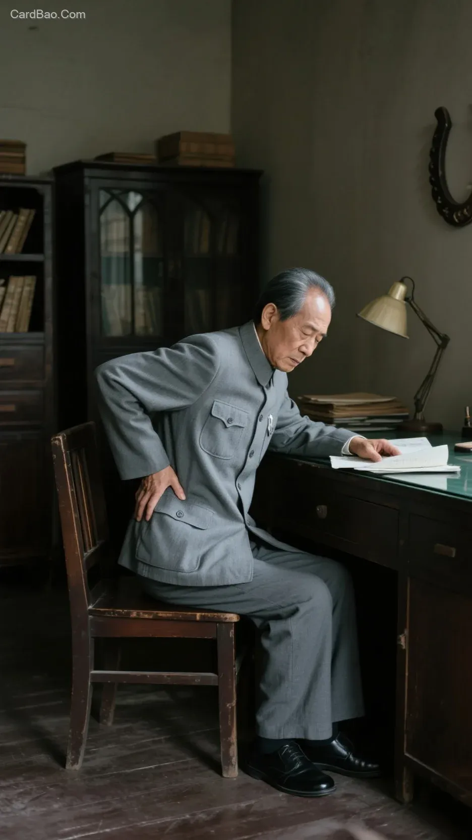 浑暗房间,一张办公桌,一个书柜,一盏马蹄灯。60多岁人,穿一身灰色中山装,灰长裤,黑皮鞋,坐在木椅上办公桌旁,一手捂着病痛的腰部,一手仍在批阅文件。全景,全身,高清,年代感。