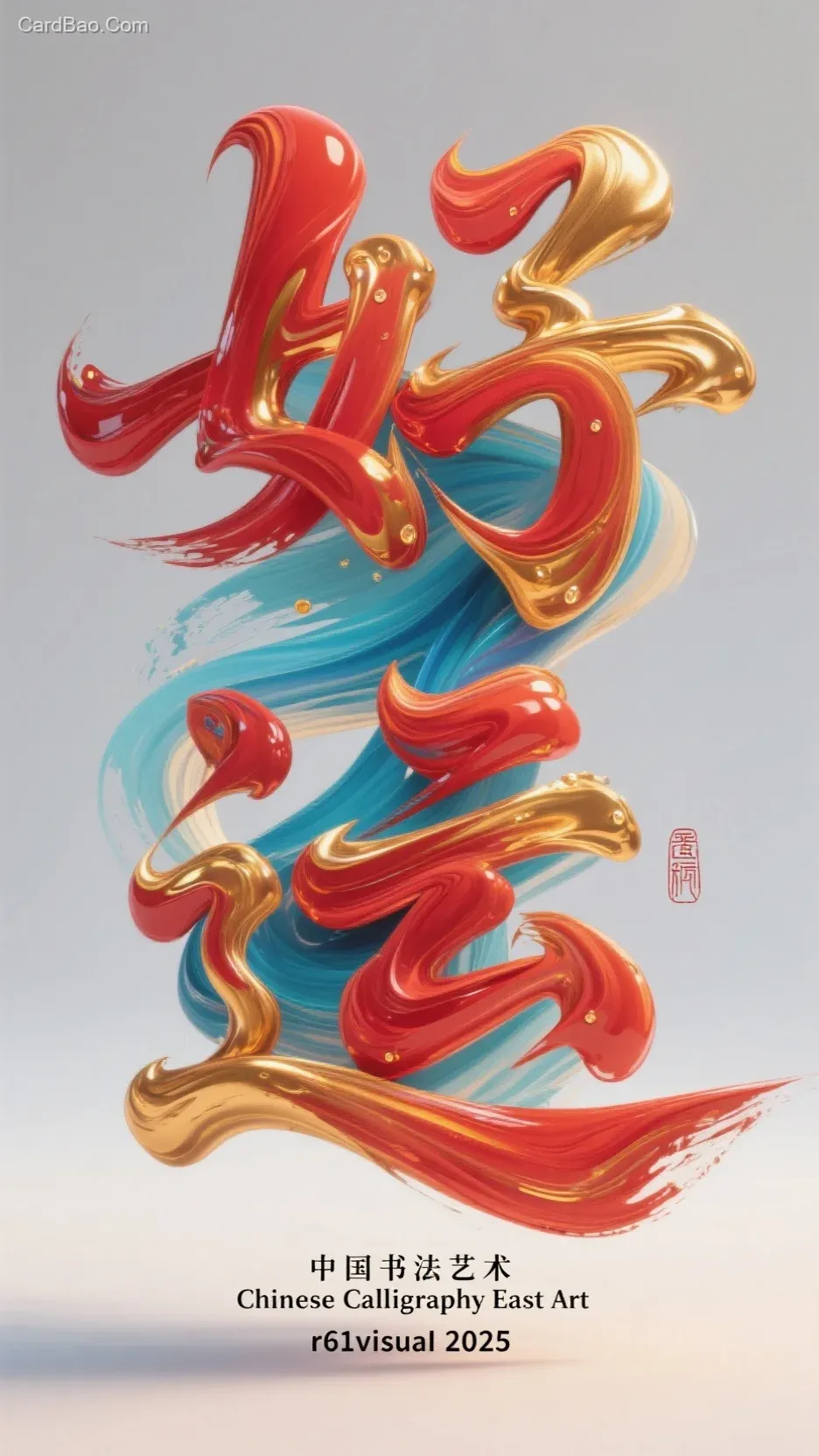 “好运”空间感立体艺术字作品,具有流动的红金色笔触,立体饱满的笔画,按照中国书法的笔画顺序书写,笔画间立体穿插,厚涂流体彩色字理念进行3层立体设计,部分笔画带有露珠的光泽和微风的动态效果。东方禅韵化表达,颜料为各种含蓝金色油画和丙烯混合颜料,笔画里的笔触清晰可见,分层明显,搭配印章,小字“中国书法艺术”,英文“Chinese Calligraphy East Art”,底部文字“r61visuaI 2025”,排版设计,C4D渲染,虚幻引擎,轮廓光,简约虚空空间背景,现代数字艺术风格。