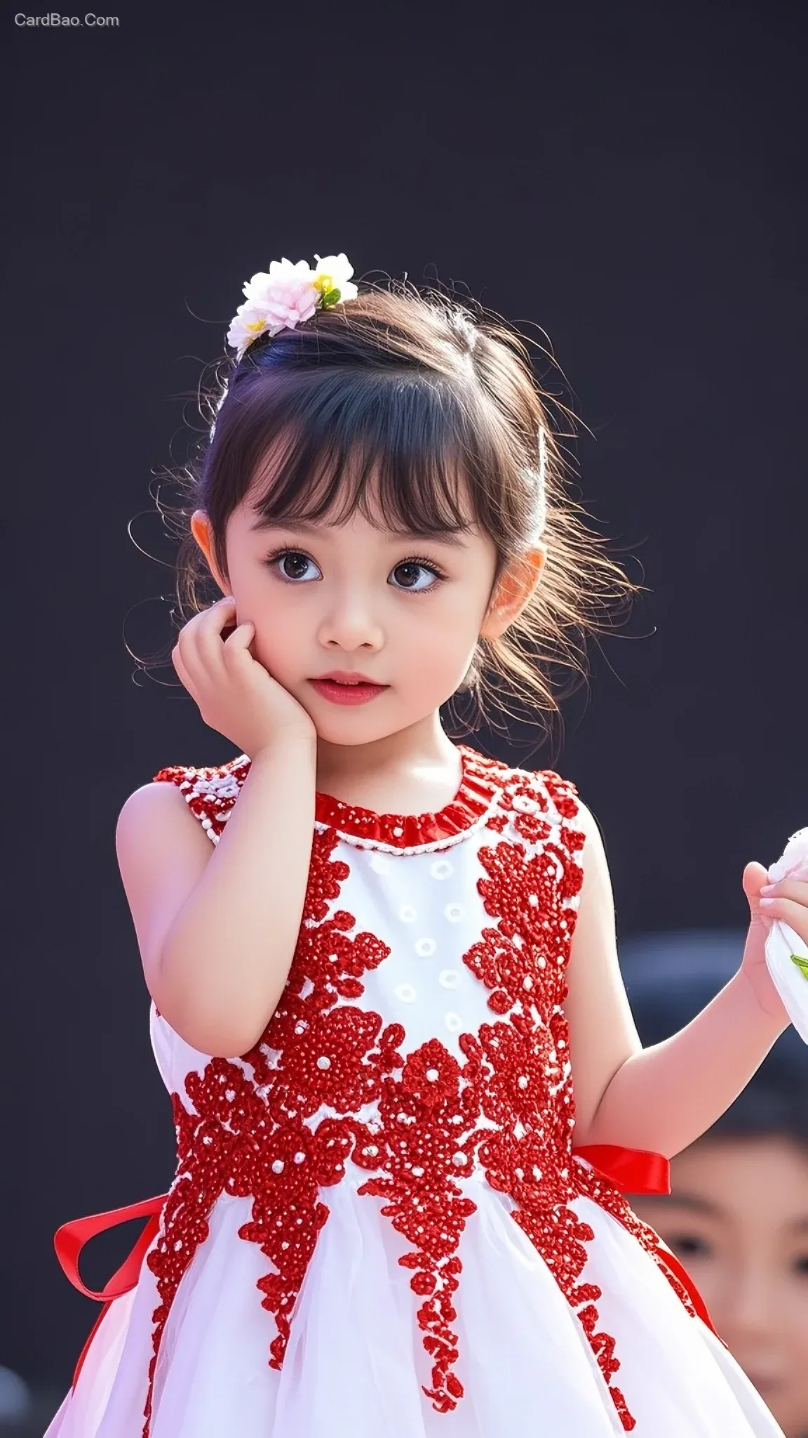 An adorable and cute 5-year-old Uyghur little girl with big eyes, thick and long eyelashes, and double eyelids, wearing a beautiful red and white dress. She has a small flower hair clip, is shown from the waist up, holding something, on stage, with a super cute and charming expression, in 32K high-definition quality.