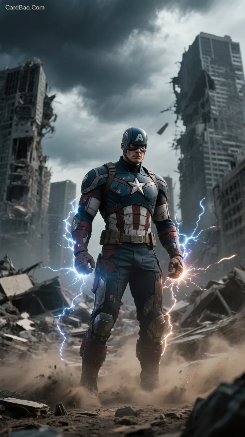 美国队长疲惫不堪站着,身上铠甲有摩擦痕迹,有能量火花闪烁,地面灰尘弥漫,背景是破烂不堪的高楼大厦废墟,阴暗的天空,乌云密布,好莱坞电影质感风格光影感,高清兰光正面照
