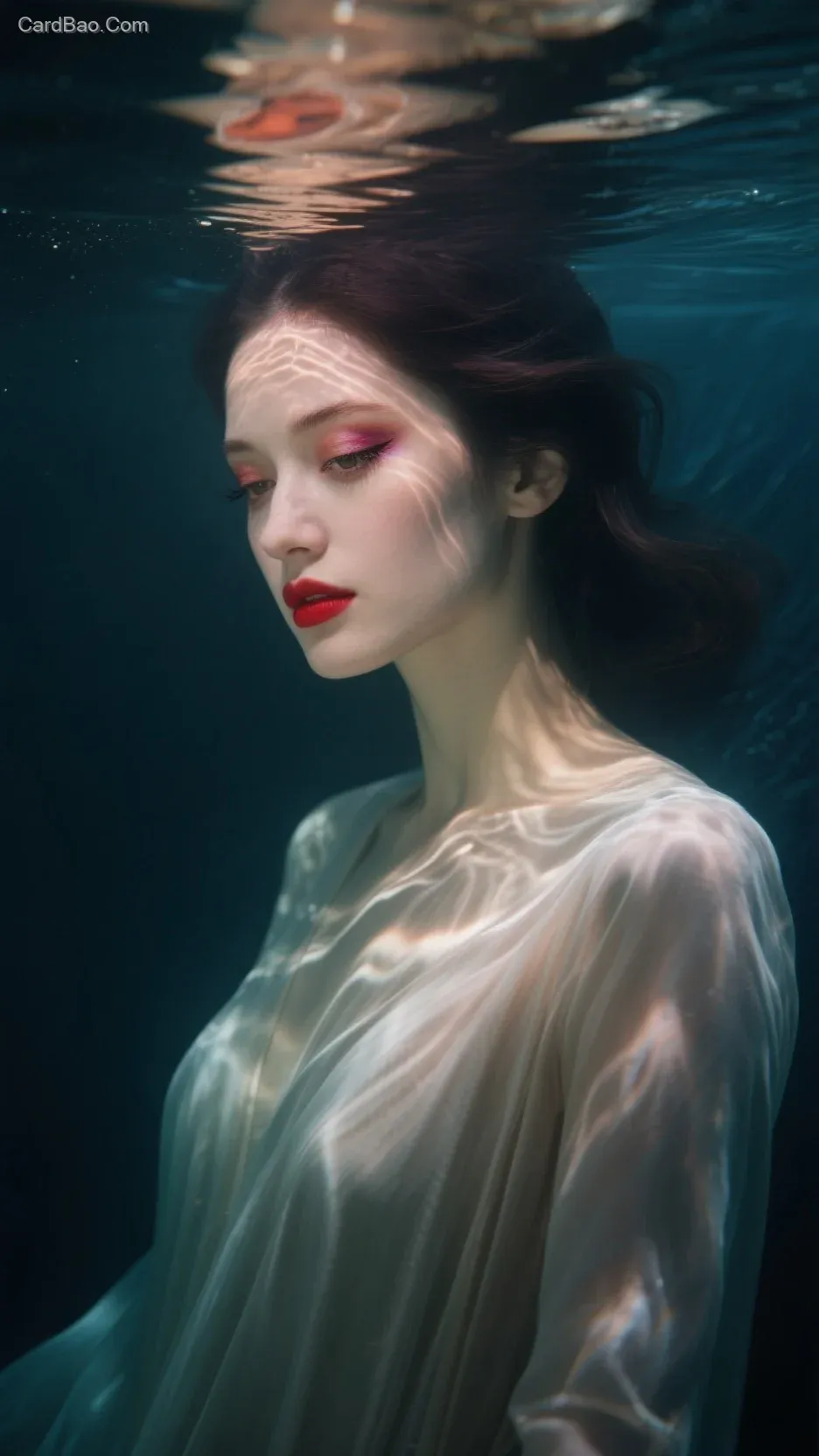 Special attention is given to the texture of light and shadow formed by the water ripples on the character's face, including the effects of light reflection and refraction. The intricate details of the makeup, such as the gradient of the eyeshadow and the texture of the eyelashes, are meticulously rendered. The subtle form of the hair floating in the water adds to the mysterious and dreamy atmosphere of the image, conveying a sense of tranquility and depth.