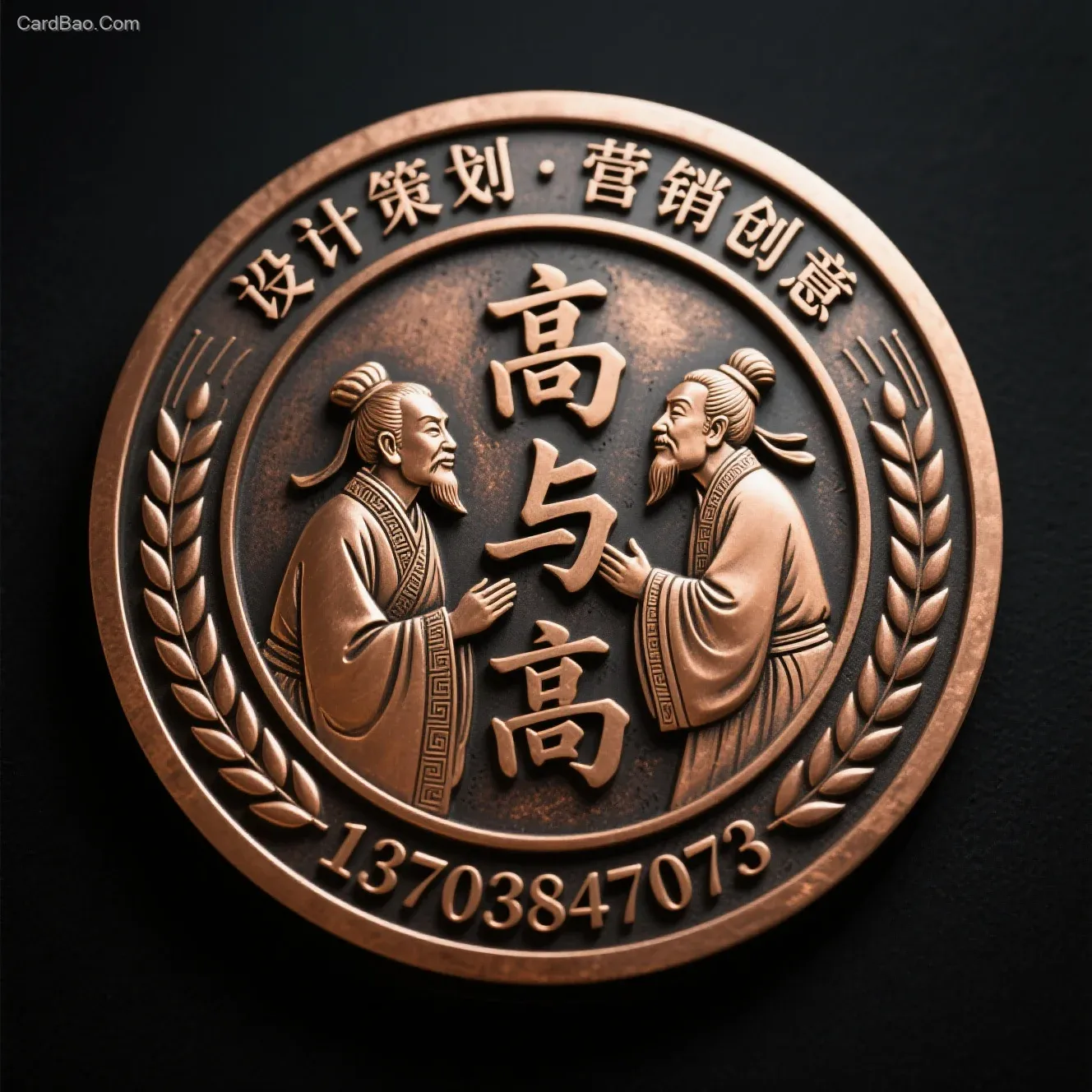 圆形徽标,正中间横排苍劲书法中文“高与高”,有两个中国传统历史名人面对面相互敬佩,青铜岩彩金属浮雕质感,圆形带边,上边边缘环绕文字“设计策划·营销创意”,下边缘环绕数字“13703847073”,左右两边对称麦穗环绕,整体形成一个完整的复古金属圆形徽章,紧凑,合理,纯黑色背景,三层浮雕不镂空,超高清质感,完整圆形