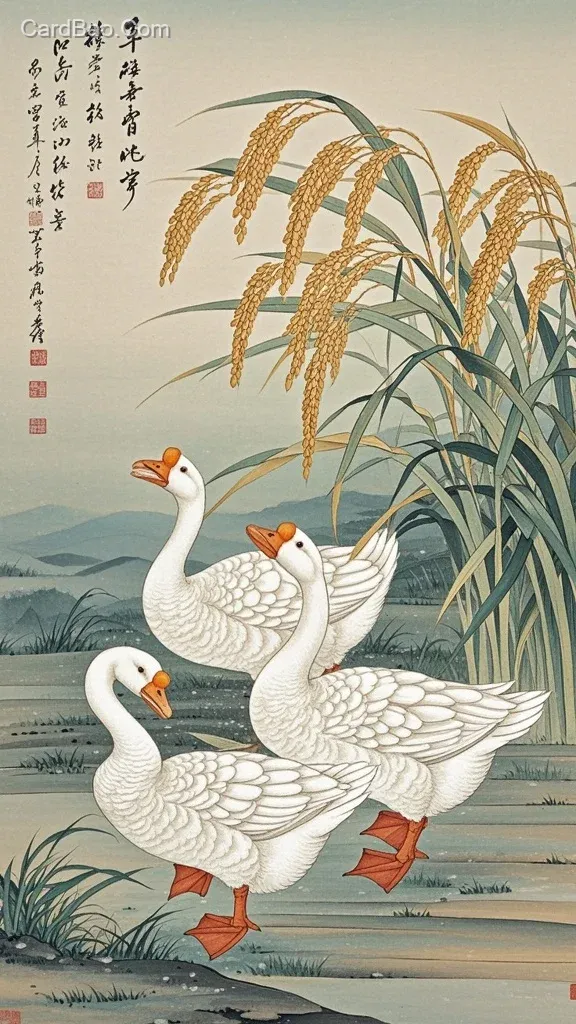 Gongbi style rice paddy theme, with delicate brushstrokes depicting the drooping forms of mature rice ears. Three tall and robust white geese stand gracefully on the ridge of the field, their feathers layered and shaded using traditional ink wash tones. The reflection in the water showcases the texture of Xuan paper. In the distance, the outlines of indigo-colored mountains are subtly dotted. The overall palette of the scene adopts a soft, elegant bluish-green tone. The Gongbi shading technique is employed to highlight the intricate veins of the rice leaves. The orange beaks of the white geese create a color contrast with the golden hue of the rice ears. Presented in 4K high definition, the artwork captures the traditional silk-like texture of Gongbi painting.