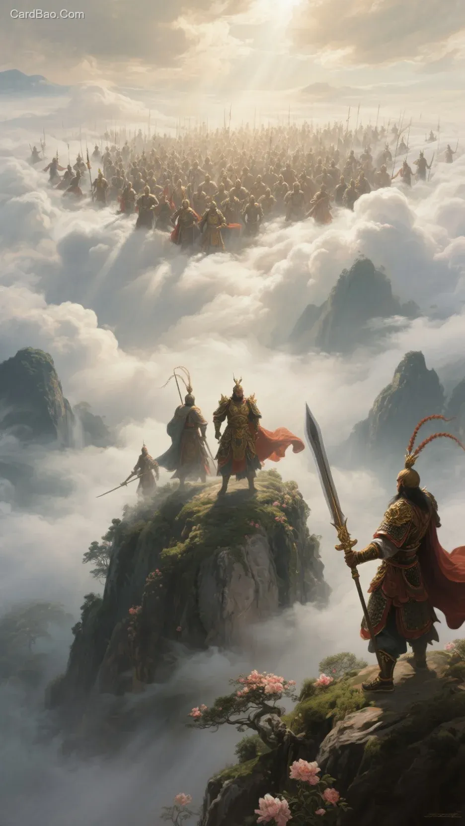以写实油画风格,云头上呈现十万天兵天将排山倒海之势。俯视花果山,杀声震震,他们威风凛凛地站立在缥缈云雾之中,光影交错,云雾缭绕,光线透过云层洒在天兵天将身上,勾勒出鲜明轮廓,营造出震撼的氛围