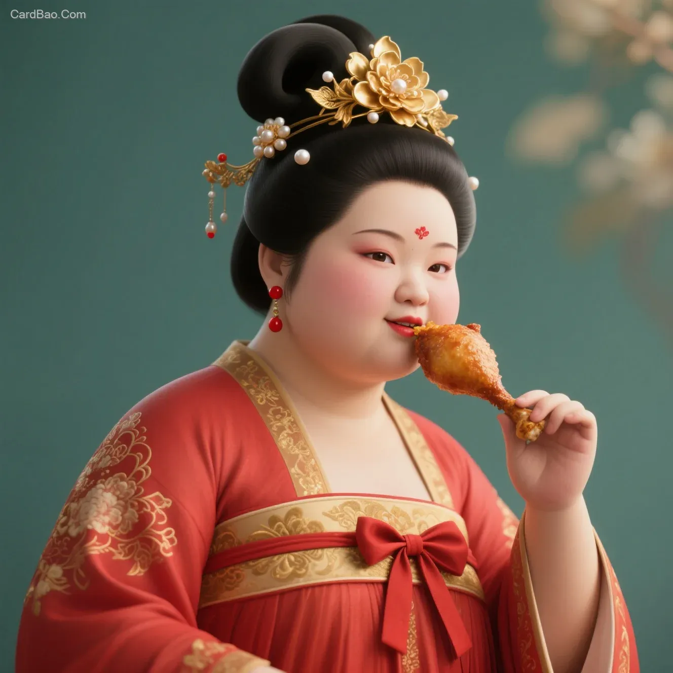 一个胖嘟嘟、五官精致、面部圆润的唐朝贵妇女子形象,梳着乌黑精致发髻、佩戴华丽金色花朵造型且有珍珠点缀头饰、戴着红色耳坠,身穿有金色花纹图案的红色唐朝襦裙,腰间系着同色系腰带打成蝴蝶结,正吃着鸡腿、姿态休闲地看向正前方镜头,写实风格的场景,近景特写,45度侧拍视角,C4D渲染,高分辨率,自信氛围,细节丰富
