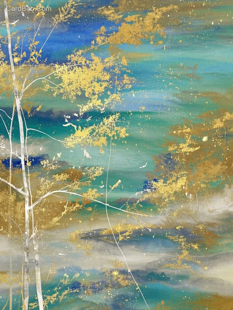 Blue, green, gold, gold leaf, sprinkled gold, gold powder, mineral pigments, dazzling light and shadow, scattered starlight, pearlescent, grand and magnificent, 8K, high-definition quality, clarity, rich colors. Birch forest.