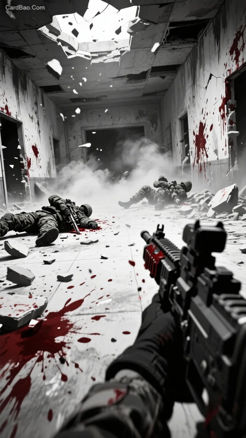 第一人称镜头急速向前推进,穿过四周掉落的碎石和尘埃切入一个更加破碎的大厅空间。拼命射击,大厅里的士兵一个个中弹倒下,鲜血四处飞溅,嘣的墙上到处都是,场景呈现黑白二次元风格,光影与废墟的组合充满戏剧性张力,整体氛围营造出强烈的视觉冲击与叙事张力