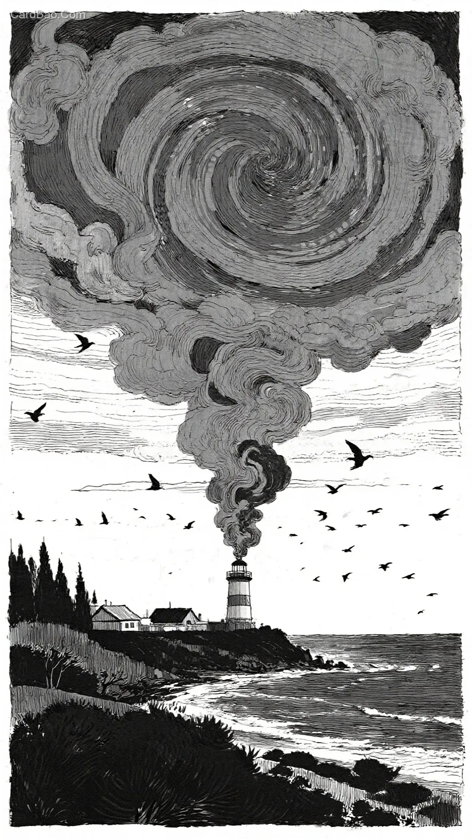 伊藤润二风格,黑白插画,艺术插画,城市风景钢笔画,背景是海岸山林,天空是梵高风格,大大小小漩涡状云雾,远方黑色的鸟群,一座灯塔伫立在漩涡里,全图黑白灰色,全景构图,远景构图