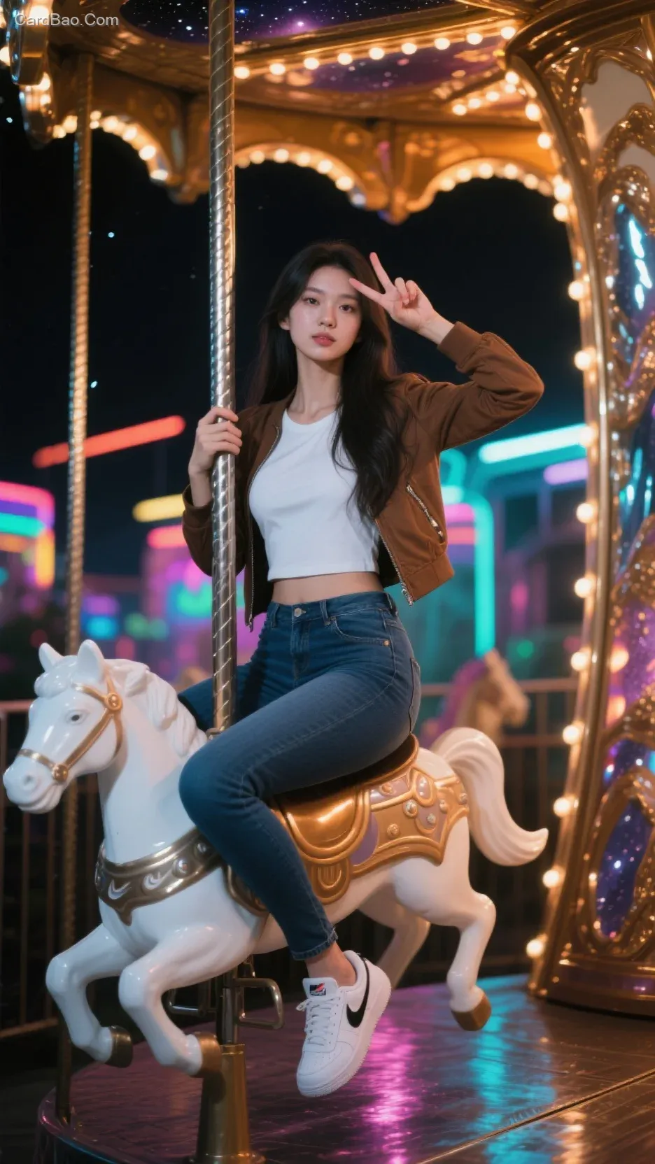主题描述:长发美女正面照,夜晚美女骑在大型白色旋转木马,白色圆领T恤搭配棕色修身夹克敞开着,深蓝色紧身牛仔裤配白色耐克运动鞋,左手握金属竖杆右手比V字手势放在额头,妆淡。美学元素:超高清8K画质,暗夜霓虹灯环境光,彩色灯光与暖调琥珀光交织,肌肤透出细腻汗腺质感。专业参数:电影级光影渲染,高动态范围成像,纤毫毕现的面部微表情捕捉,牛仔裤布料反光处理,旋转木马金属漆面反射星空特效。