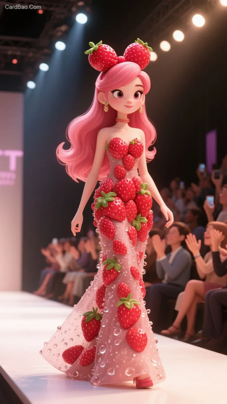 3D卡通风格,oc渲染一个在T台走秀的卡通女性形象。她的头发是草莓颜色的长发型,发型简约时尚,头上戴着草莓制作的蝴蝶结,她身穿一条由草莓设计构成的礼服长裙,裙子上带有水珠效果,呈现出新鲜的感觉。背景是一个灯光璀璨的T台秀场,台下有观众在鼓掌、拍照,营造出热闹的氛围,4k电影质感