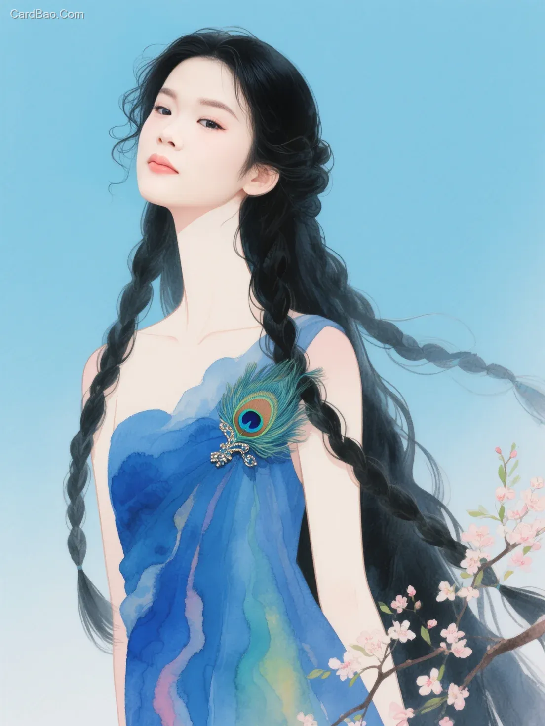 Fluid watercolor, atmospheric, spacious, line illustration, hand-drawn illustration, matte texture, iridescent light and shadow, minimalist composition, elegant background, spring elements, high-definition, transparent, vibrant colors, healing, fashion illustration woman, charming, sexy, disproportionate, slender neck, slightly raised head, curly eyelashes, small mouth, small nose, high-end blue fashion, peacock brooch, fluffy and messy floor-length braid, strands of hair falling, solid gradient light blue background, full-body shot, abstract watercolor illustration, cartoon cute touch, fresh style illustration, no deformities in hands and feet, detailed precision, close-up of face and hands, wallpaper, white space.