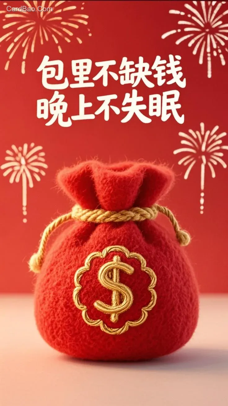 ##帮我生成图片:图片中央位置是一个红色的钱袋子,有金色的线条勾勒出的轮廓和细节,图片的上方有一段白色的艺术字体的文字:“包里不缺钱 晚上不失眠”,背景有几个烟花图案,烟花的线条是白色的,背景是红色的主色调,整体油画风格,超清晰4K。图片风格为羊毛毡,比例 9:16。