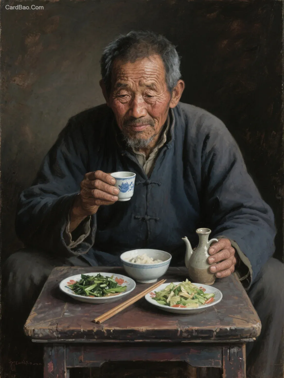 这是一张典型的老农民脸庞黝黑而沧桑,布满皱纹,朴实勤劳吃苦耐劳,手拿小瓷杯,坐在小桌前,桌上有两盘素菜,筷子和碗,一个小酒壶,油画写实风格暗黑