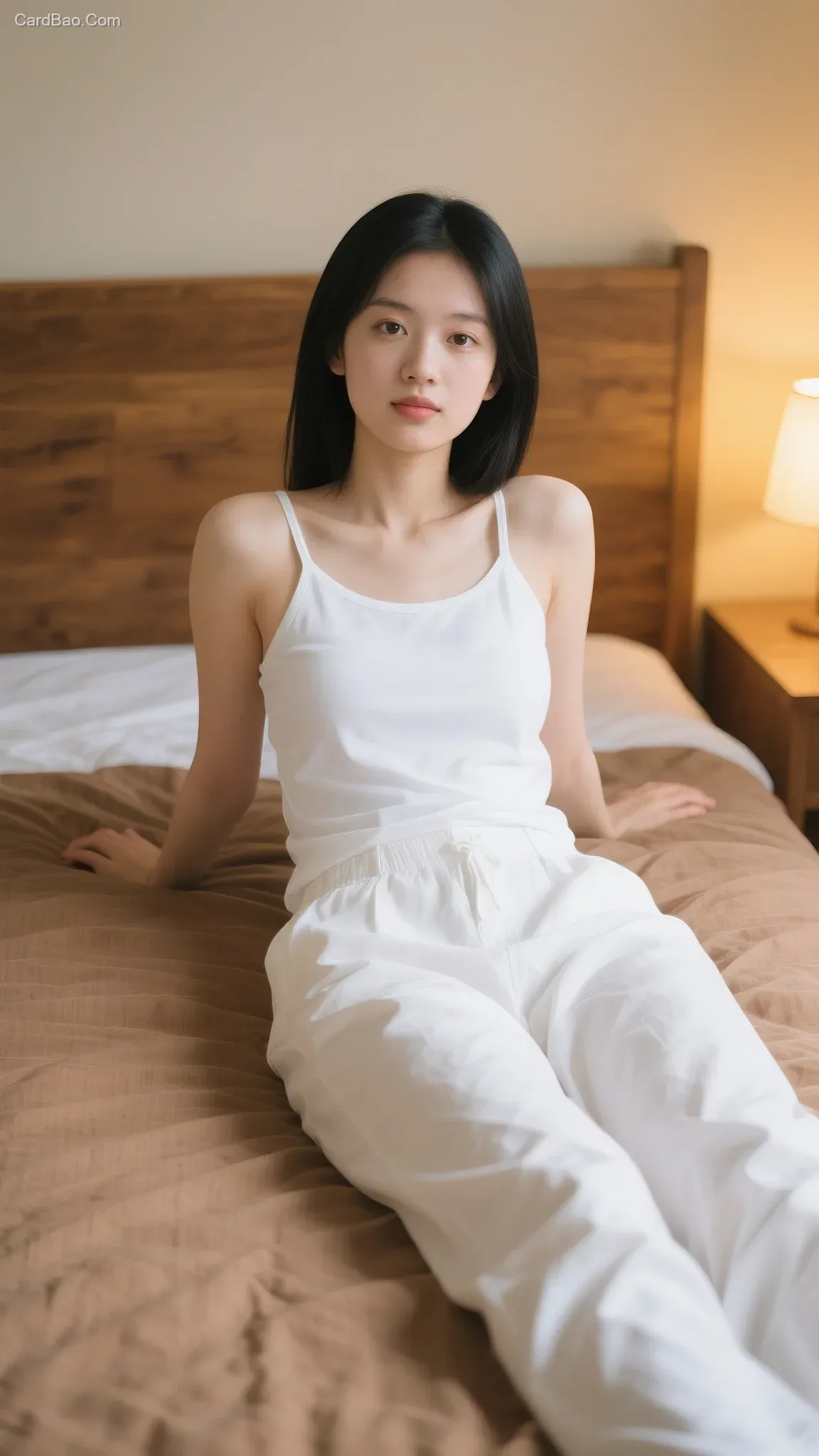 卧室中的慵懒少女**1. 高清蓝光32K画质,HDR高动态光影,中近景2. 女性24岁面容17岁,白嫩苹果肌,浅淡笑容3. 清纯风风格,突出舒适感4. 黑色及肩直发(35cm),自然散落5. 圆脸型,眉骨柔和,鼻头圆润6. 身穿#FFFFFF背心,#FFFFFF长裤7. 仰卧姿势,双腿自然伸展8. 背景为木质床头与暖黄灯光9. 背心圆领设计,肩带适中10. 长裤版型宽松,裤长及踝11. 光线明亮柔和12. 颈部线条修长13. 画面中心构图14. 整体色调温馨淡雅15. 造型休闲舒适16. 服装细节突出面料质感17. 氛围宁静祥和18. 光影效果自然19. 细节精致考究20. 姿态放松自然21. 发丝柔顺有光泽