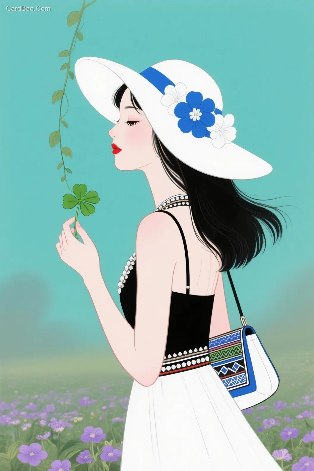 ##手绘插画,线条插画,一位侧脸时尚芭莎女子,长长的睫毛,翘翘的鼻子。红红的嘴唇微启,白色宽边大帽子,蓝白相间的装饰花朵,乌黑的头发,表情宁静、妩媚,细细的脖子,一件合身的黑色吊带上衣,下穿一条白色裙子,手里拿着蓝白相间的小手包,半身像,姿态优雅,动作自然。纯色背景渐变青绿色,4K高清画质,背景满墙是虚化朦胧的紫色小花。简单,飘。好多好多四叶草藤,垂下来。像窗帘一样!女孩正好玩四叶草,地上开满鲜花。苗族女孩