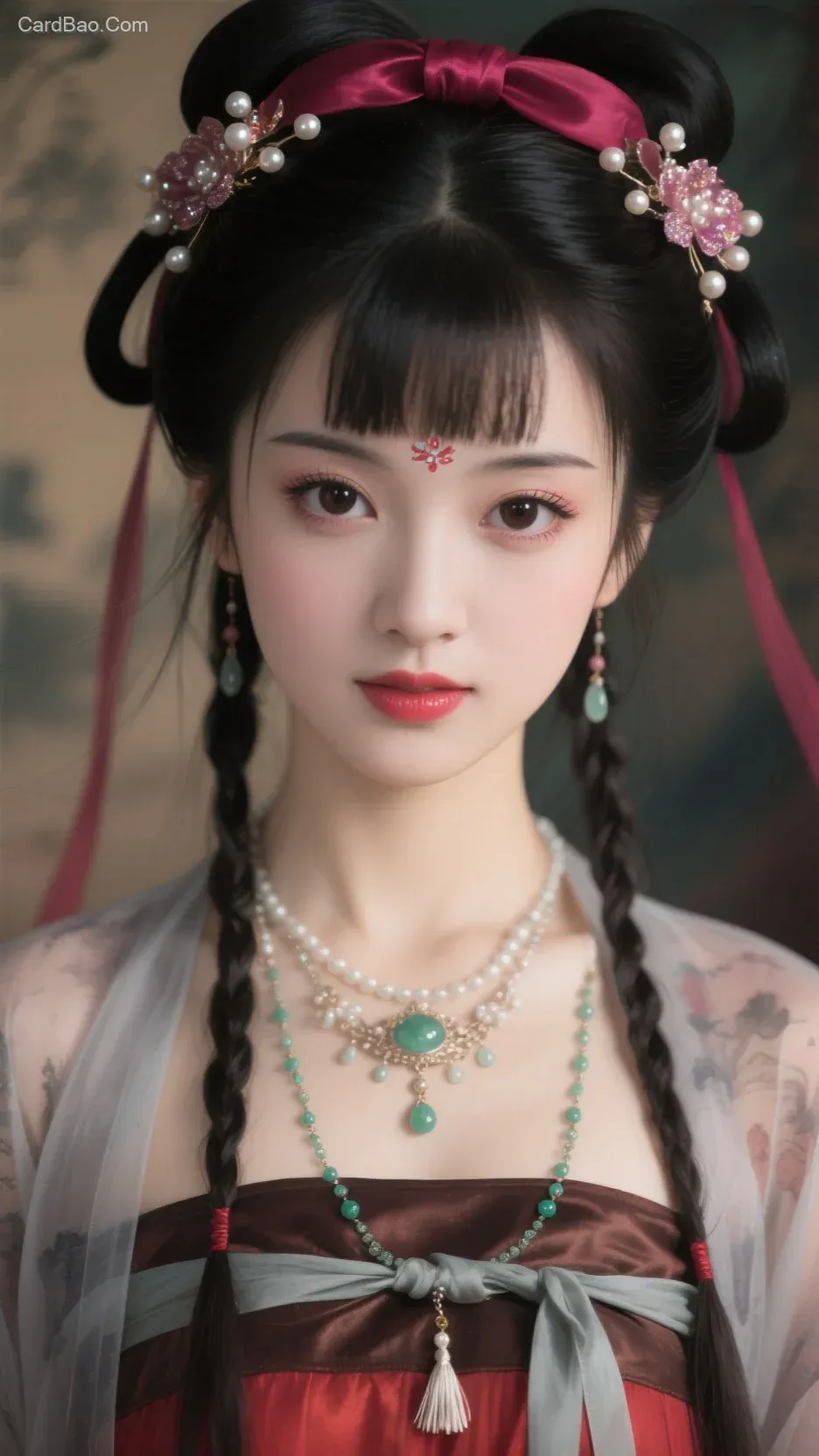 Ancient-style beauty, whimsical and lively, with a playful and adorable demeanor. She has straight bangs and a double-loop concentric bun, adorned with a deep rose-red satin headpiece featuring pearl floral decorations. Two strands of hair hang in front of her chest, braided with silk ribbons and embellished with jade chain ornaments and tassels, adding to her charming and lively appearance. She wears a silk Hanfu-style undergarment paired with a sheer gauze outer robe, in a color palette of deep maroon, dark brown, and light gray. Around her neck is a delicate necklace, with clear lines and strong contrast between light and shadow. The image is ultra-high definition, evoking a sense of cool elegance.