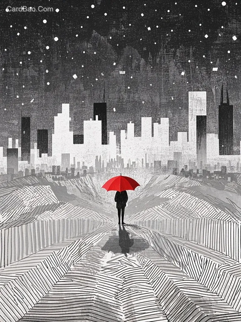 插画设计,孤独的人,人撑着一把红色的伞,主色调为强对比的黑白,艺术,非凡创意,等高线线条,光照