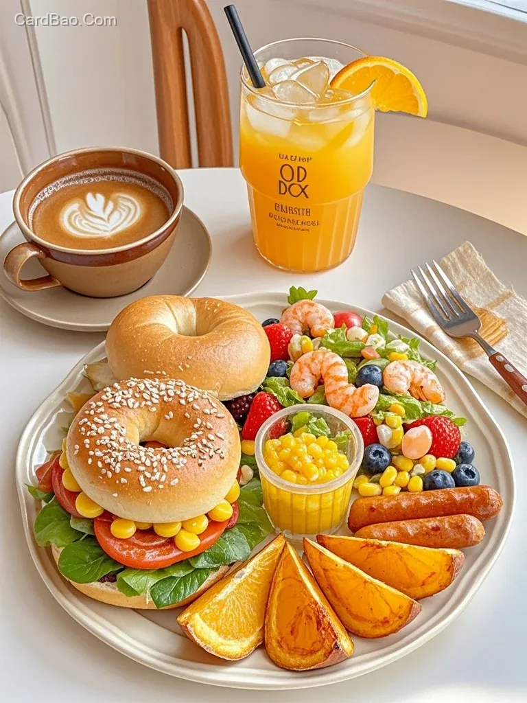 手绘漫画动漫插画,元气brunch🥯贝果三明治虾仁烤薯角🥗美式🍊 🍽️食物满满的早餐拼盘~ 搭配冰冰的橙汁美式 消暑解腻🍊 食材:🥯 贝果➕生菜➕芝士片➕蟹柳煎蛋➕虾仁➕烤肠➕牛油果切片摆花朵造型➕烤薯角➕玉米➕莓果 咖啡:🍊 马蹄珠珠➕冰块➕橙汁➕气泡水➕意式咖啡液。高清,画面干净,精致,还特别有食欲。小资轻奢高级网红风