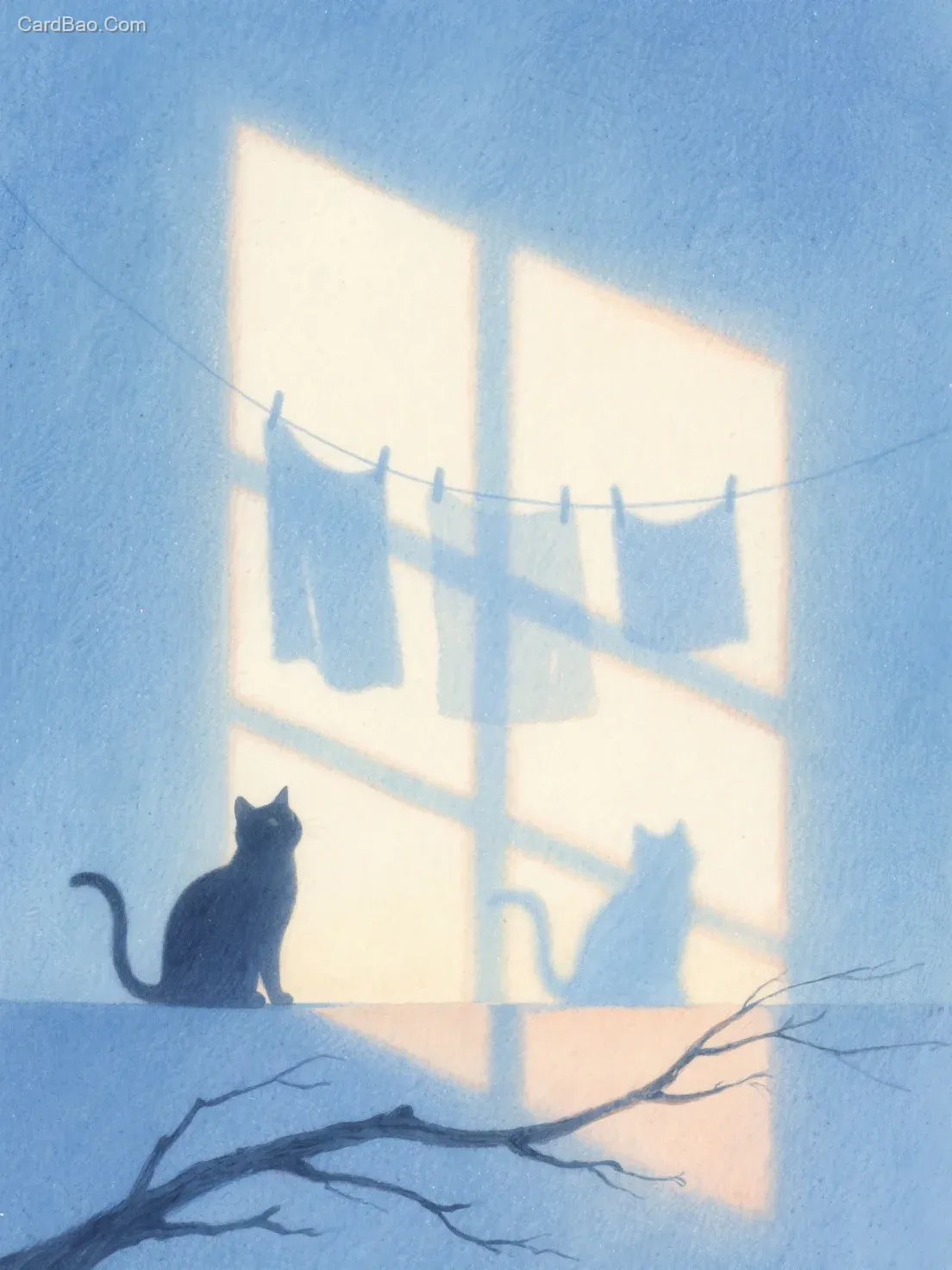 At the moment when the checkered shadows cast by the clothesline slowly creep across the wall at dusk, a kitten's tail, the swaying shadows of tree branches, the hazy interplay of light and shadow rendered in pale blue watercolors, the intertwining of loneliness and dreaminess, a cool color palette, and an ethereal sense of unreality.