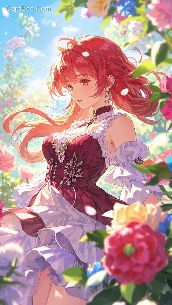二次元酒红色头发的女生,花,阳光,礼裙