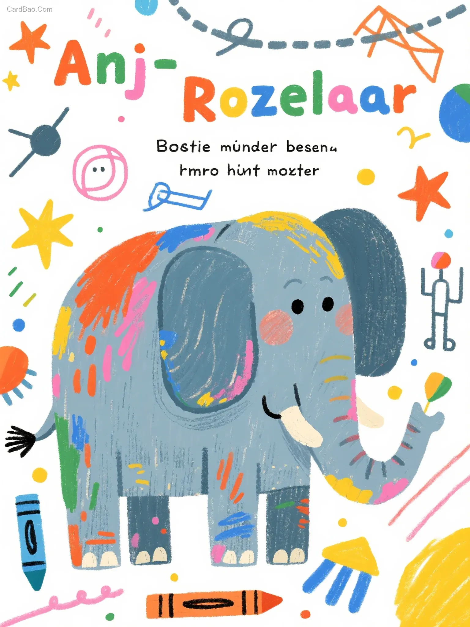 Draw a cute elephant illustration in the style of crayon drawings, inspired by the illustrator Angie Rozela. Incorporate elements of deconstructionism, with textured paint strokes and a hand-drawn feel. The image should feature exaggerated forms, and the background can include abstract patterns such as stars, motion symbols, and other playful elements. Add unique text to the composition to create a lively and fun visual effect. Use a color palette reminiscent of Wassily Kandinsky's style.