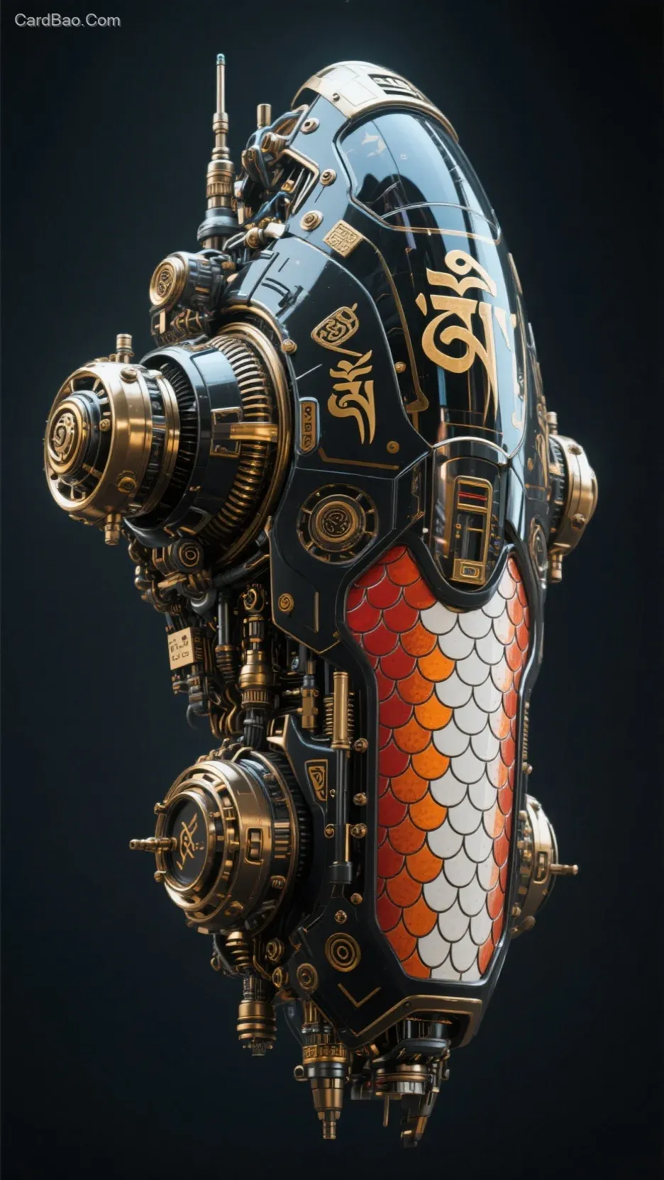 Mechanical Era, a colossal mechanical spaceship with a unique design, adorned with Tibetan script patterns, featuring mecha elements, a glass-like texture, metallic sheen, clearly visible intricate components, and a color palette of black, gold, red, orange, and white, with scale-like textures.