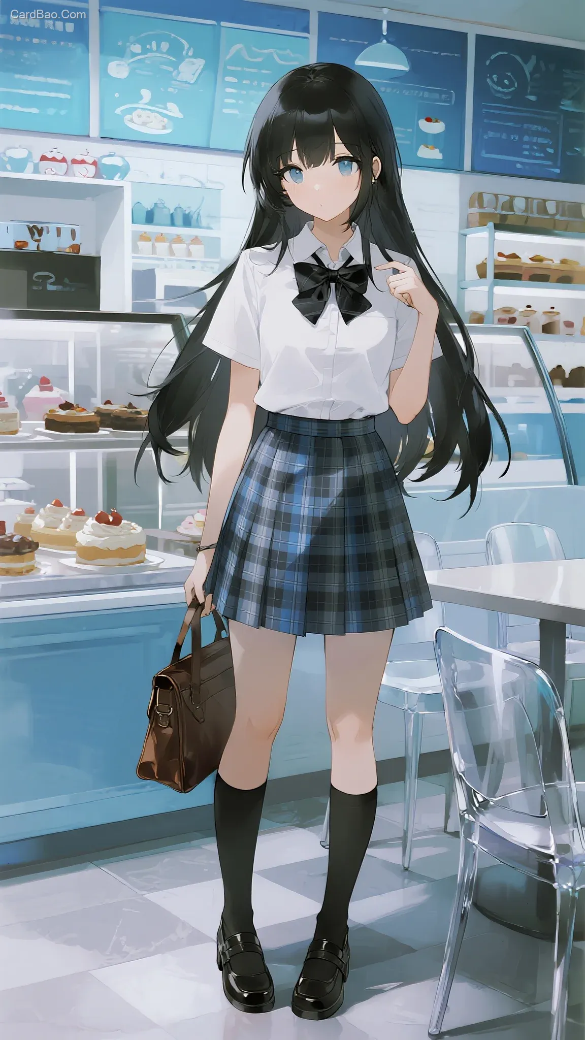 年轻女子,黑色长发,穿着白色短袖衬衫、黑色大蝴蝶结领结、蓝灰格子百褶短裙,搭配黑色过膝长袜、黑色鞋子,手持棕色小包,在室内甜品店场景(背景有展示柜、甜品、透明椅子 ),呈现出青春可爱、甜美俏皮的风格 ,CG,厚涂插画,最佳质量。