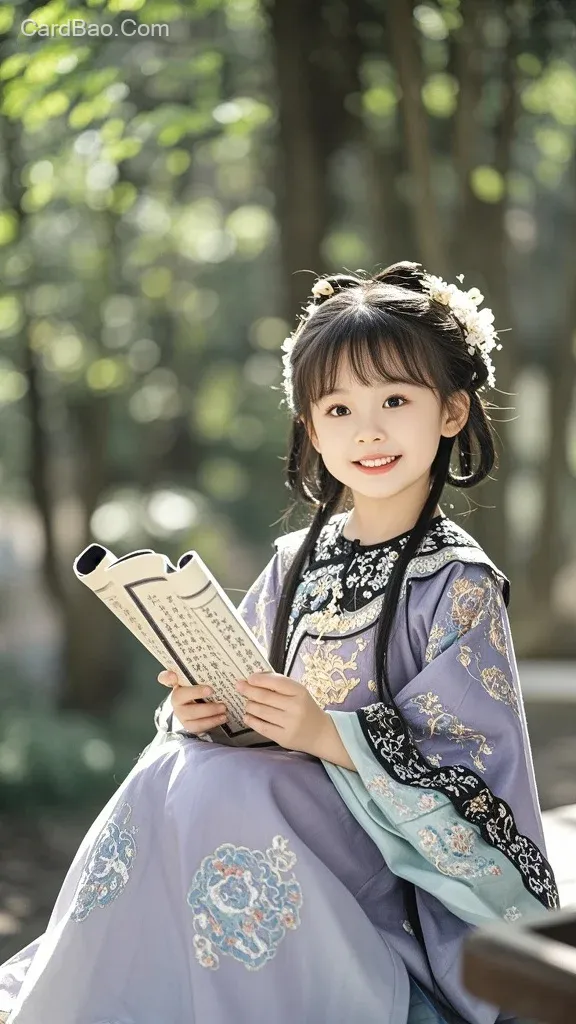 生成一个古代儿童形象,身穿华丽的紫蓝汉服,发丝细节,天真浪漫,拿着古诗词本,小孩圆脸,大眼睛,女孩。背景林中凉亭