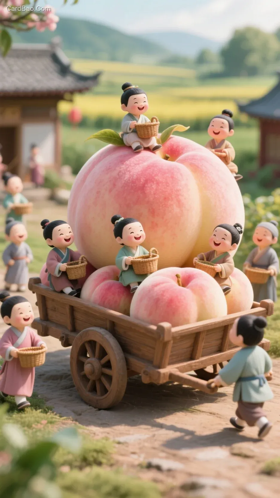 中景,平视角度,明亮光线,高清画质,超高精度微缩模型渲染技术。古代田园风光背景下,一群身着宋代服饰的迷你小人围绕着一辆装满巨大桃子的木制手推车。有的小人坐在桃子上,手中抱着小篮子,脸上洋溢着开心的笑容;有的小人在车旁推着车往前走,神情专注又欢快。巨大的桃子色泽粉嫩,表皮纹理清晰,手推车的木质纹理也细致可见。整体场景充满生活气息,热闹欢快。