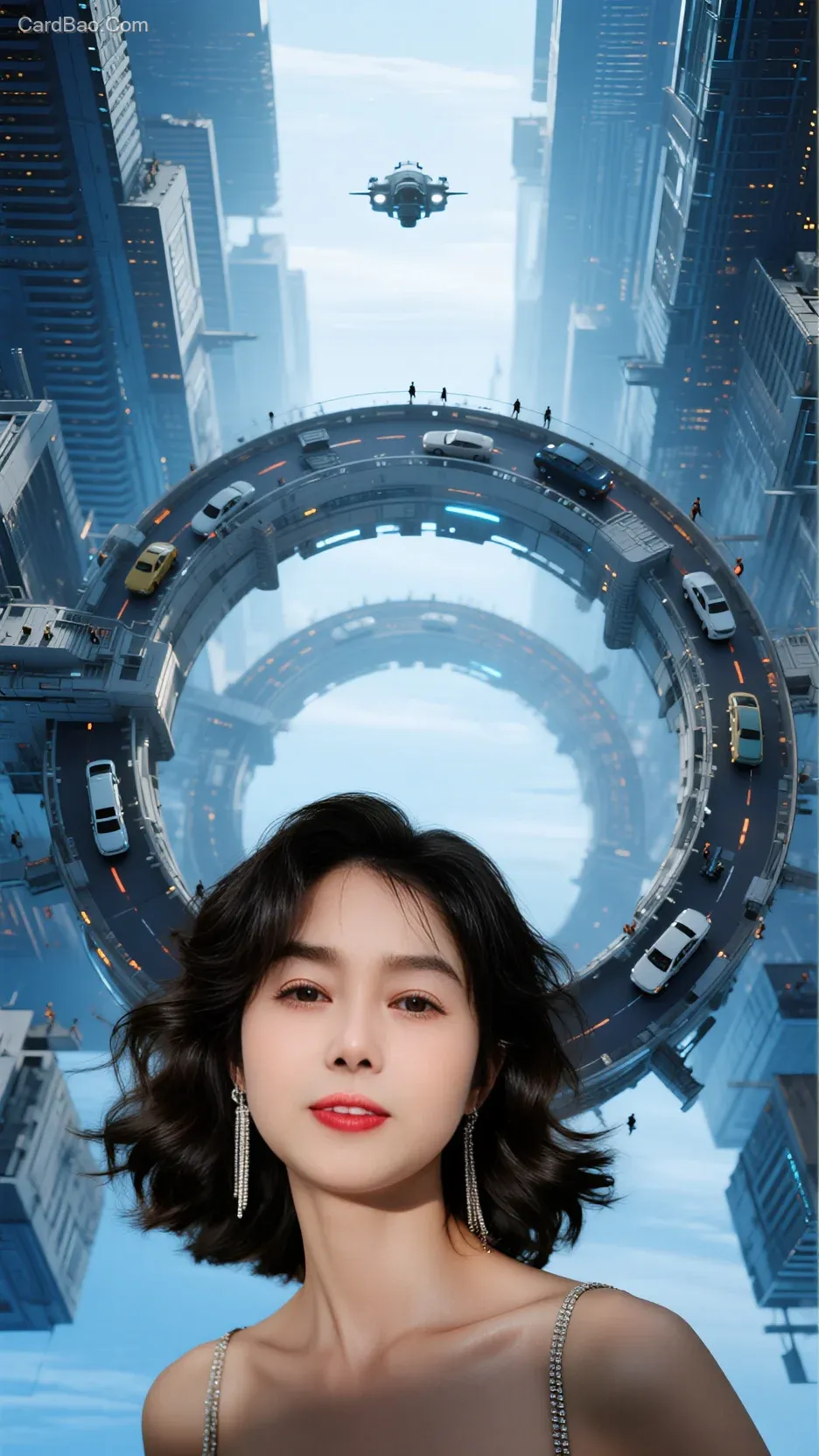 ##人美,心善气质型美女,高雅,富贵,高傲,自大美女,齐肩时尚发型微卷飘飘的洒洒,时尚服饰,耳坠,眉目清秀,妆容精致高清,蓝光,高贵,典雅,大方,气质非凡的容貌。微缩世界,倒挂的未来摩天大楼城市和它的镜像,车水马龙,飞行器,复杂未来先锋城市构造,超现实主义,莫比乌斯环,微缩世界,倒挂的未来摩天大楼城市和它的镜像,车水马龙,飞行器,复杂未来先锋城市构造,超现实主义,莫比乌斯环,梦幻虚拟,弯曲旋转的楼梯相互联结,人在其中行走,对称,几何规律排列整齐,真实世界虚拟,弯曲旋转的楼梯相互联结,人在其中行走,对称,几何规律排列整齐,真实世界正面照正面照