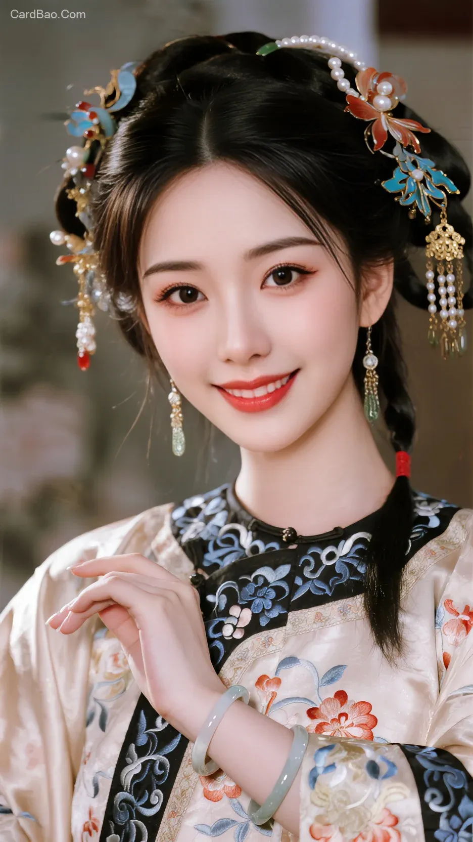 8K ultra-high definition resolution, with sharp focus, noise-free and optimized with anti-aliasing, allowing details to be magnified up to 100%. A telephoto lens is used to create a depth-of-field effect, with a blurred background while maintaining macro-level details. A 3D anime-style ancient beauty with classical makeup, possessing realistic and delicate skin texture that resembles flawless porcelain, featuring natural rosy cheeks, smooth and radiant skin with visible pore details. She is dressed in a silk Hanfu or Tang-style outfit, with clear embroidery textures, patterns of phoenixes or peonies, and gradient colors, with flowing hems. The 8K-level silk folds and metallic reflections are distinct, jade bracelets exhibit a translucent quality, and the details and shine of tassels and pearl earrings are fully rendered. Silk folds appear natural, embroidery stitches are clearly defined, fabric light and shadow reflections are precise, metallic highlights are accurately depicted, layered sheer skirts are visible, lace edges are sharp, and ancient-style embroidery patterns are symmetrical and meticulously crafted.