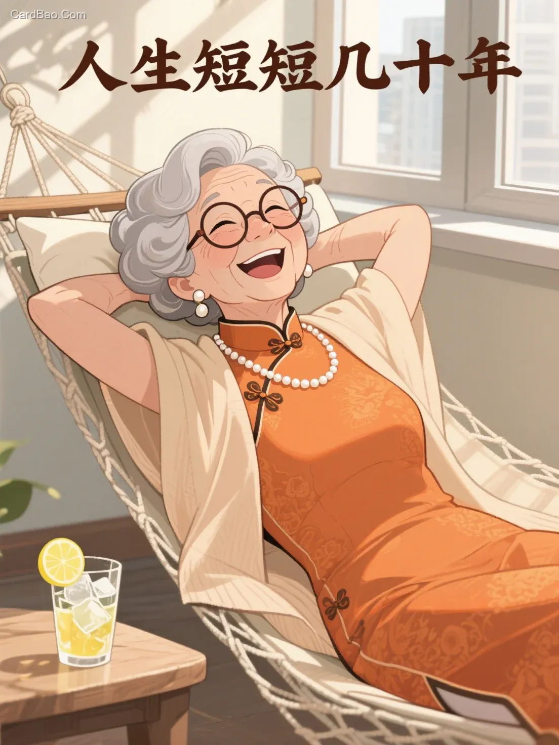 An elegant and noble Chinese elderly lady with gray-white curly hair and fair skin, wearing a retro orange cheongsam with a light-colored shawl. The style features hand-drawn brushstrokes, healing illustration, cartoonish and cute elements. She is adorned with a pearl necklace and pearl earrings, exuding a lively and childlike charm. She wears round reading glasses, is tall and slender with large eyes, appearing gentle and graceful while laughing heartily. The illustration is in a healing anime style, depicting a gentle and dignified grandmother. The overall style is modern urban healing anime illustration, showcasing a beautiful modern woman with a bean paste-colored lip, fair skin, and an elegant demeanor. The scene is set in a midday room with dappled light, by a bay window. The grandmother is lying in a hammock with her hands behind her head, a gentle breeze brushing through her hair as she closes her eyes contentedly. A small table nearby holds a glass of lemonade with ice cubes gently clinking, creating a quiet and comfortable atmosphere with delicate light and shadow effects.