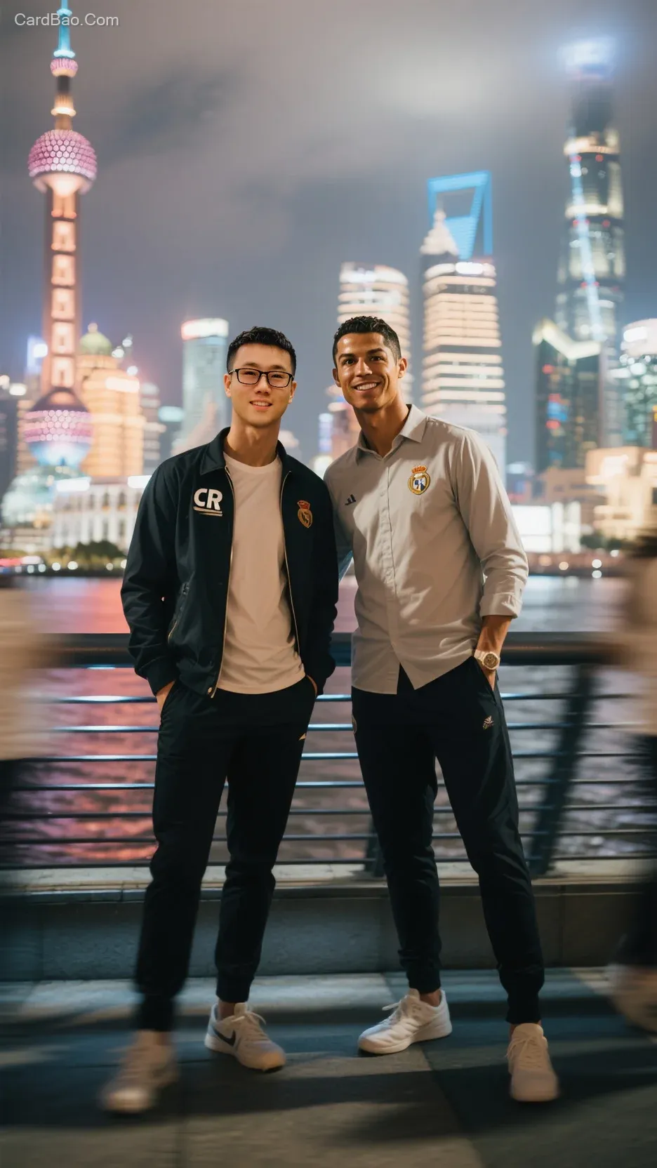 ##请你生成张极其平凡无奇的自拍照,没有明确的主体或者构图感,就是随手一拍的快照,照片略带运动模糊,阳光或室内打光不均导致的轻微曝光过度,整体呈现出一种刻意的平庸感,就像是不小心拍到的一张自拍。主角是一个28岁的中国帅哥,左边是穿着便装的C罗,右边是穿着便装的罗纳尔多,他们三人在外滩合影,背后是陆家嘴夜景