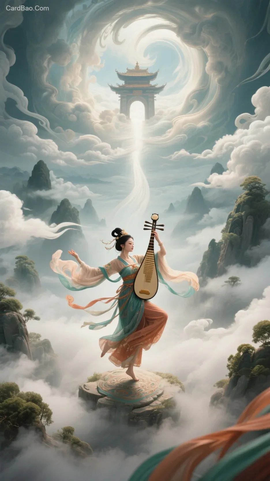 一位身穿古装的女子跳着敦煌反弹琵琶舞,云雾笼罩的奇幻空间中有流云和直通天上南天门的漩涡,奇幻古风风格,远景,神秘奇幻氛围,精美细腻