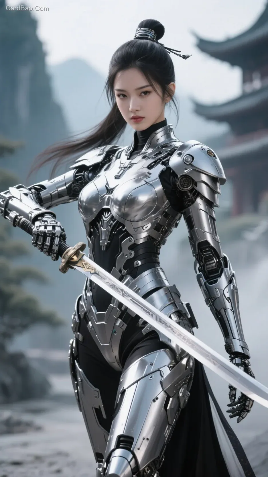 Cold and alluring sexy mech heroine, silver armor with sword shadows, ancient martial arts style, stunning debut!