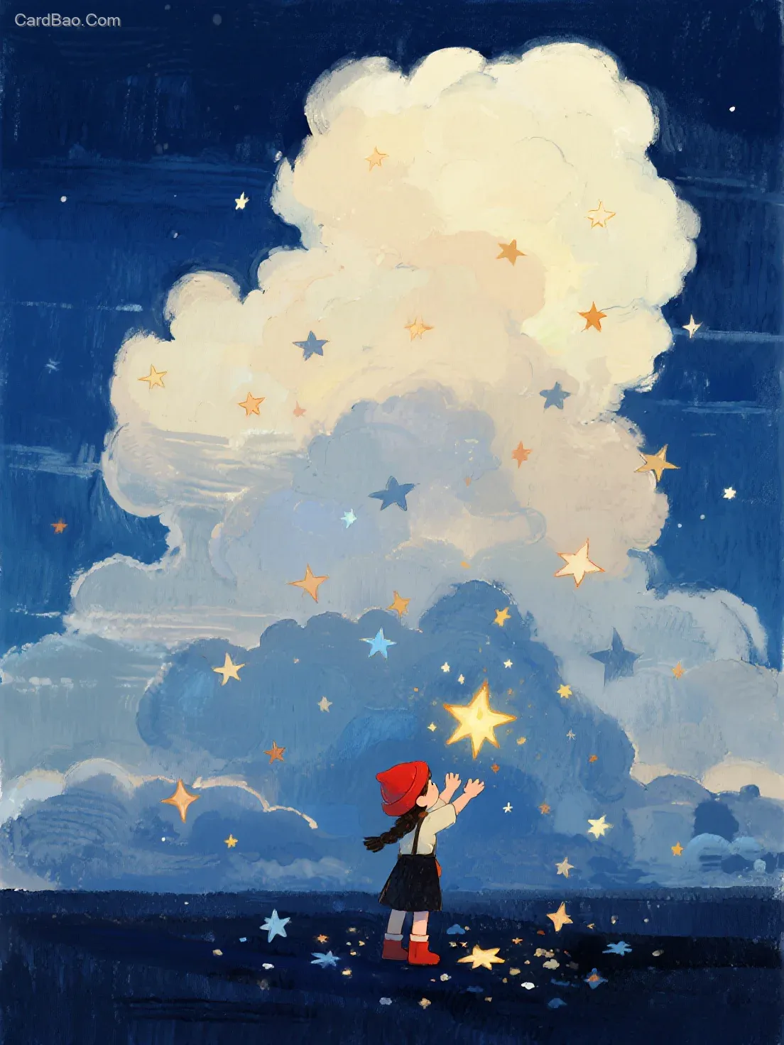 Deep blue background, exaggerated clouds and mist, stars scattered all over the ground, a little girl wearing a red hat stretches out her hands, trying to catch the stars, imagine a healing illustration, high definition.