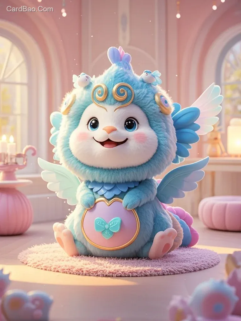 请帮我生成一个海马,雉鸡翎,鸽子翅膀元素的精灵棉花宠物,灵性灵气,聪明机灵,可爱忠诚。一双微笑喜眼。背景画面简洁