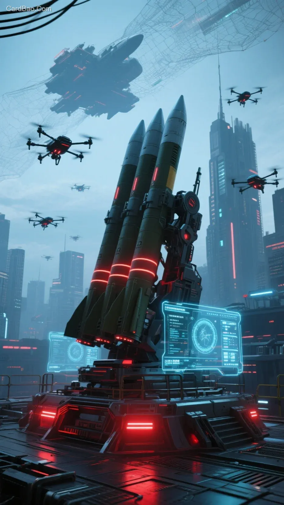 未来感的大型导弹发射平台,高科技金属材质,强烈光影对比,全息投影界面显示数据,无人机群环绕,背景是未来城市和空中防御网,军事科技风格,细节丰富的导弹发射装置,冷色调为主,红色警示灯点缀