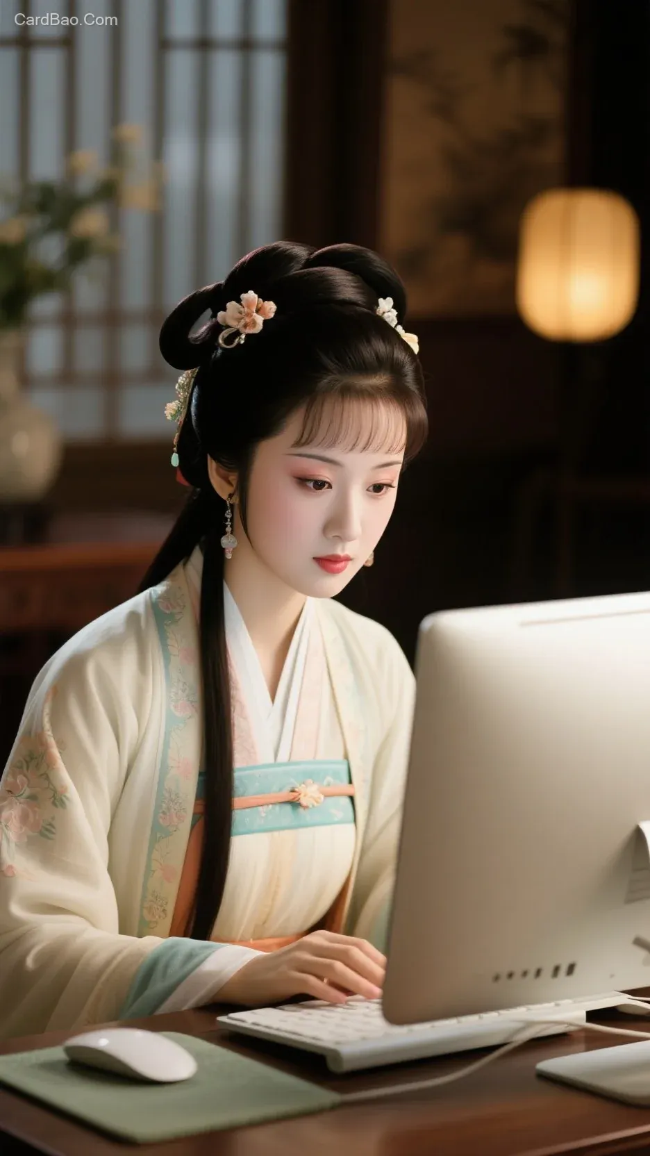Lin Daiyu wearing ancient-style clothing, working at a computer.