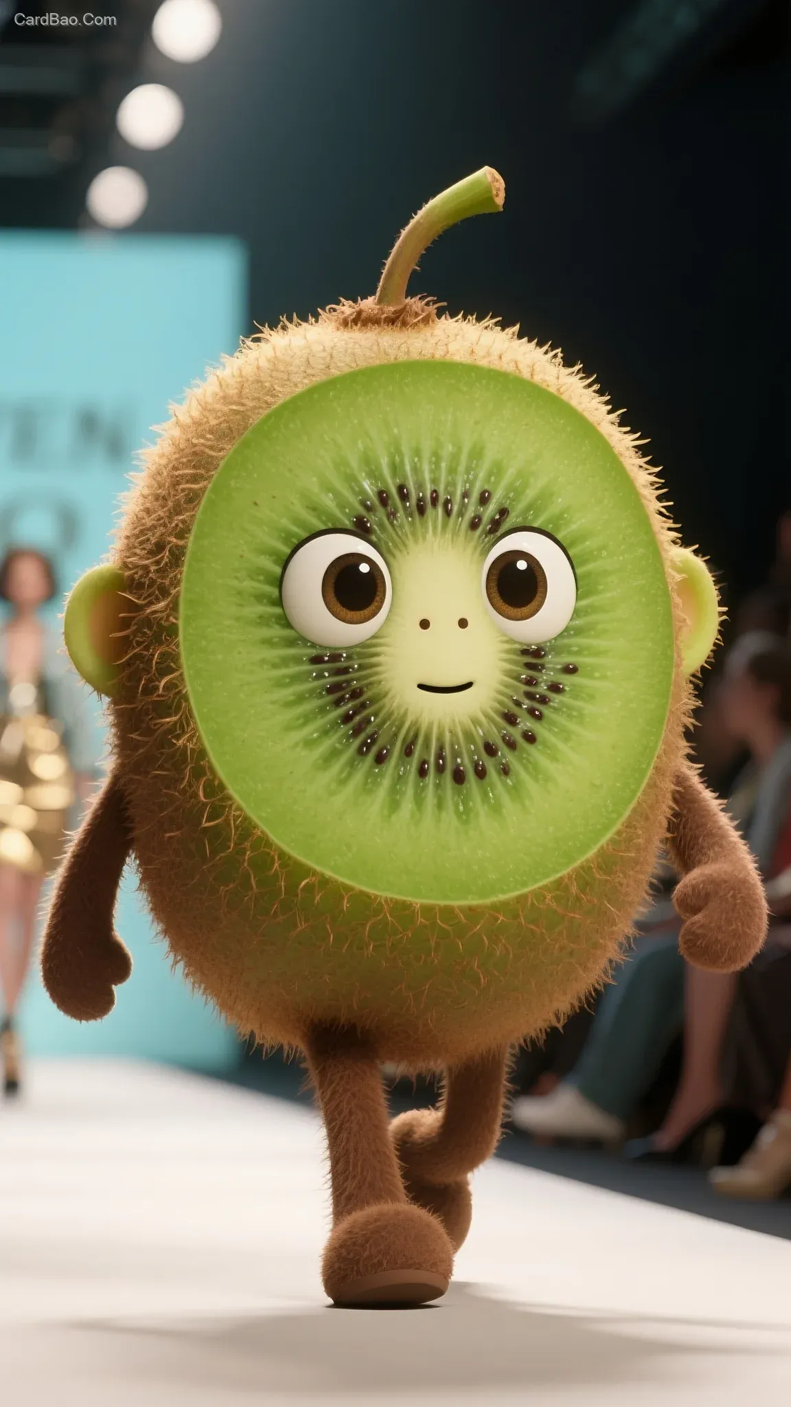 3D动画风格,拟人化猕猴桃,毛茸茸绿色果皮身体,棕色四肢与脸部,圆润可爱大眼睛,头顶带猕猴桃果梗,在时尚T台走秀,可爱有趣氛围,高细节渲染