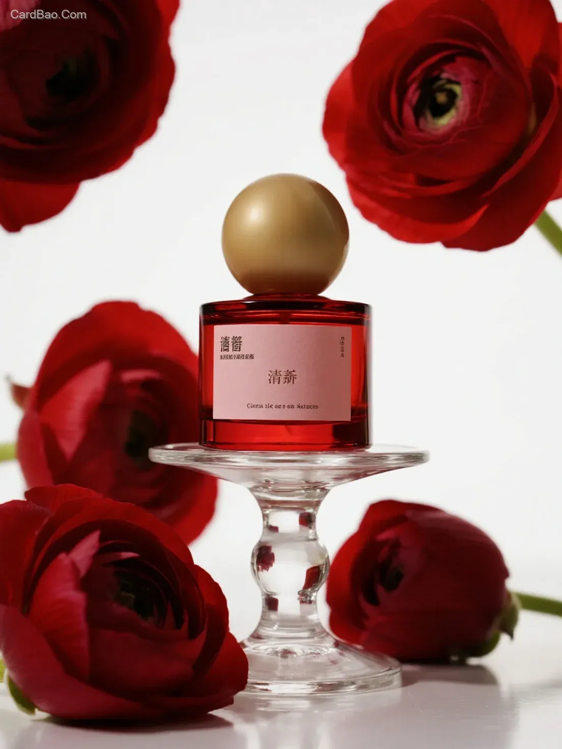 A fresh and elegant perfume promotional image featuring a red bottle with a golden spherical cap, a pink label displaying product information, placed on a transparent glass pedestal, surrounded by red flowers. The style is minimalist and sophisticated with a white background, soft lighting, and a balanced composition that focuses on the product.